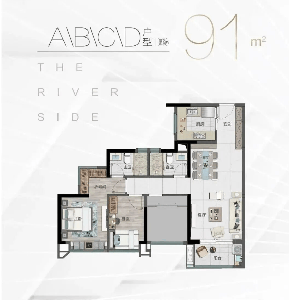 更值得称道的是,项目得房率高达91%,远超市场平均水平(通常75–85%)。这意味着91㎡的实际使用面积接近83㎡,空间感更强,实用性更高。