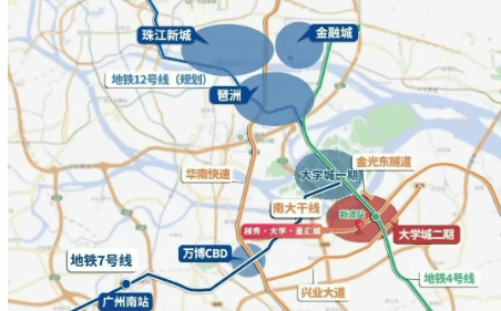 越秀大学星汇城位于国际创新城核心区域,地处琶洲以南,紧邻地铁 4 号线新造站。这里不仅是广深科技走廊与科创中轴的交汇点,还被纳入大学城二期规划版图,享有 “南中国硅谷” 的美誉,汇聚了丰富的教育与科研资源,发展潜力巨大。