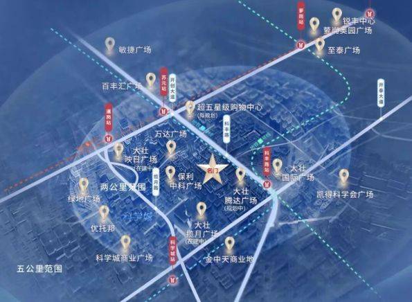 项目鼎立科学城 “芯” 商圈,周边环绕着万达广场、大壮国际广场、揽月广场(在建中)、映日广场(在建中)、腾达广场(规划中)五大广场,且项目旁拟规划建造五星级购物中心(以实际建设为准)。丰富的商业资源汇聚,让业主能够轻松享受繁华的都市生活,满足日常购物、休闲娱乐等多样化需求。