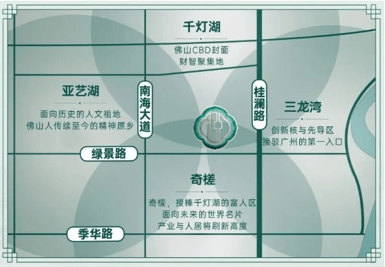 交通枢纽:项目位于桂澜路与绿景东路交汇处,处于禅城祖庙、亚艺湖、千灯湖、奇槎四大板块的几何中心,享有便捷的交通网络。周边“四横三纵”路网(包括桂澜路、南海大道、佛山一环、魁奇路等)与地铁2号线、3号线、4号线(建设中)及规划中的6号线形成立体交通网络。