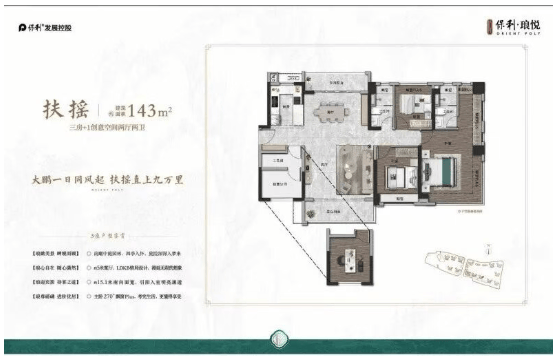建筑面积约143平方米的“扶摇”户型:LDKB一体化设计,客厅、餐厅、厨房和阳台连通,形成超大聚厅;南北对流双阳台,兼顾晾晒与观景功能;主卧套房面积超过33平方米,配备独立衣帽间与卫浴,设有270度景观飘窗。