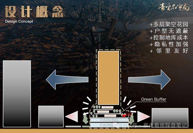 社区整体采用抬升式地形设计。项目通过地面抬升约20至30米的方式构建高差空间结构,这种设计在城市豪宅产品中较为常见。抬升结构能够有效强化景观视野,同时在城市界面上形成更强的私密性保护。底层空间通过停车库、架空层以及公共会客空间组合形成多维度生活场景。3层地下车库+2层架空结构,使得首层住宅的实际视野高度相当于传统住宅的高层位置。这种设计对于城市景观豪宅而言是非常关键的价值点。
