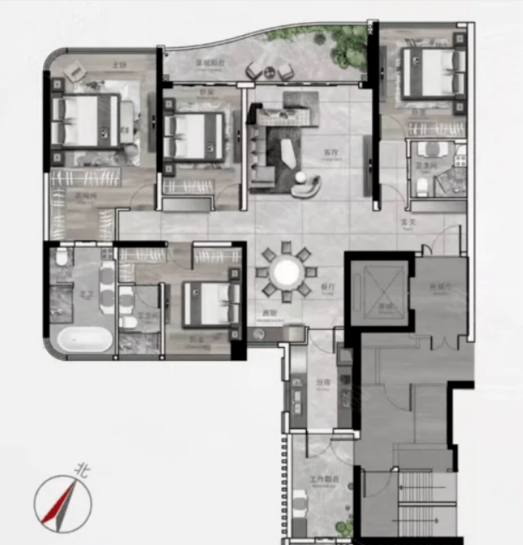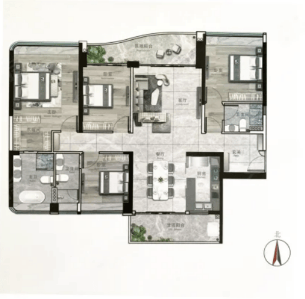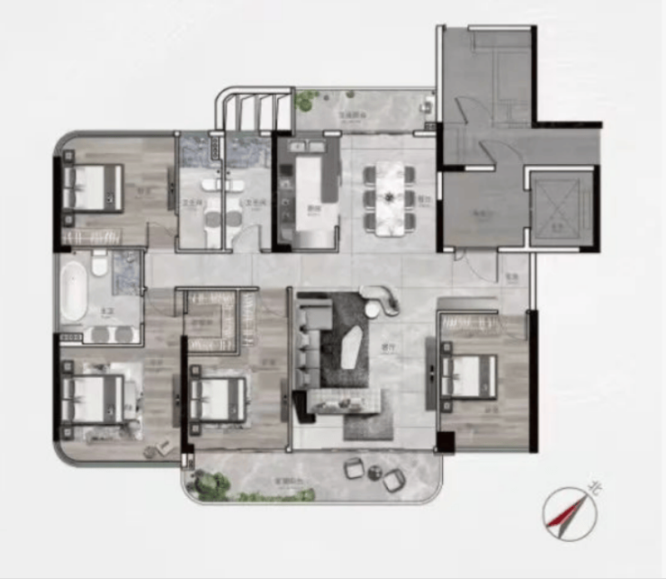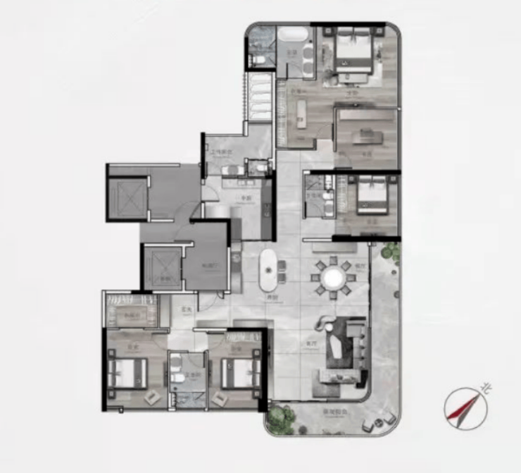 233㎡四房两厅三卫是项目的热销主力,2梯2户专属感更强。南北通透格局让江风穿堂而过,7米L型阳台兼具晾晒与观景功能。三个卫生间均干湿分离,其中两间为主套卫,长辈房带独立卫浴,充分尊重多代同堂的生活节奏。最小房间面积达9㎡,灵活改造为儿童房或书房毫无压力。