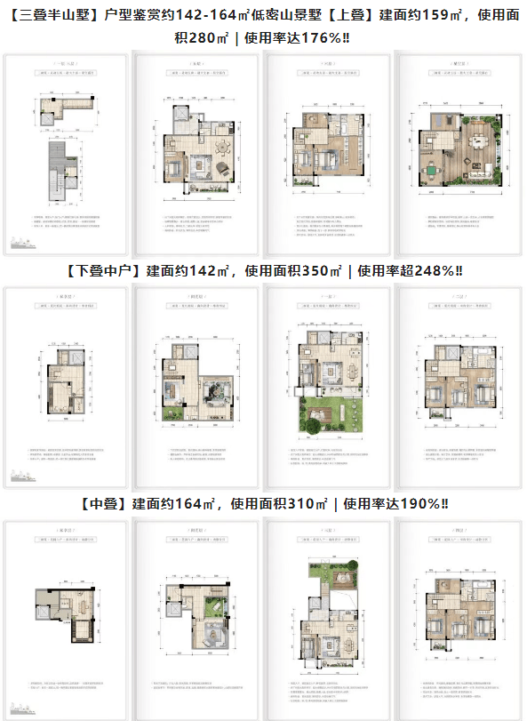 五矿壹云台当前主推四叠产品,建面约123–139㎡,总价区间530万至960万,堪称广州东部稀缺的低密山景墅。更令人震撼的是其空间利用率:下叠边户建面仅142㎡,实际使用面积却高达430㎡,使用率突破305%;下叠中户使用面积350㎡,使用率超248%;上叠建面159㎡,使用280㎡,使用率176%。这些数据背后,是创新的“三面宽+双花园入户+全卧朝南”设计,以及地下空间、夹层、露台的高效整合。尤其是下叠产品,拥有南北双庭院、双层采光井,实现约20米纵深采光,堪比独立别墅体验。在限墅令趋严的当下,此类高得房率叠墅已成为改善客群的稀缺选择。