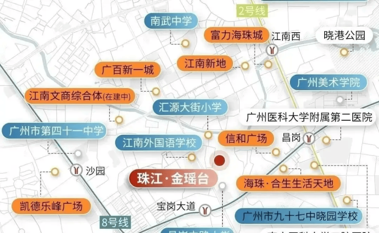 根据海珠区教育局 2025 年招生政策,珠江金瑶台对口区一级的汇源大街小学,该校与广州市江南外国语学校同属一个招生组别,为孩子的升学提供了良好的基础广州市海珠区人民政府。项目对面就是昌岗中路小学和海珠江南外国语学校,步行几分钟就能到达,家长接送孩子十分方便,省去了长途奔波的烦恼。