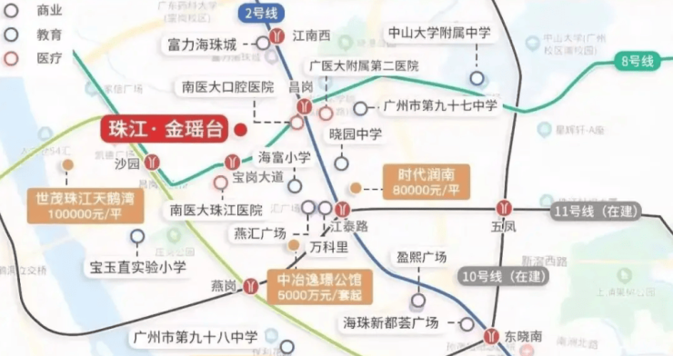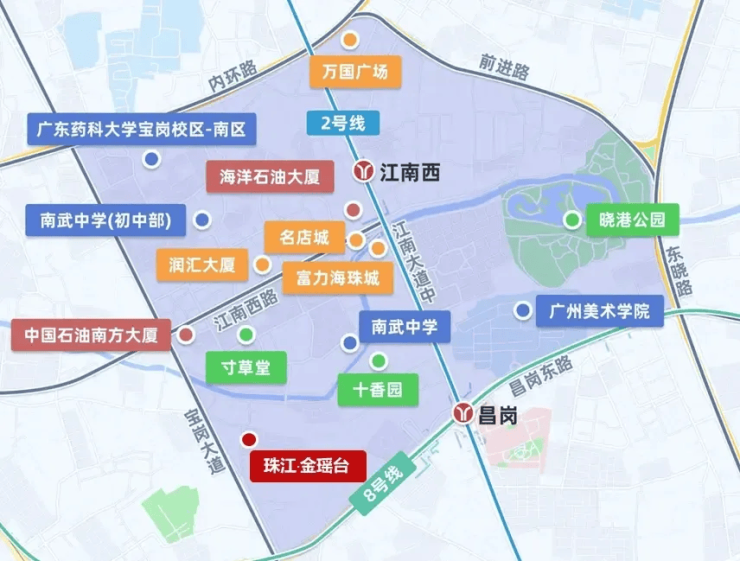 同时,项目距离地铁 2 号线江南西站仅 800 米,步行 10 分钟左右即可到达。2 号线作为广州南北向的交通大动脉,北连白云国际机场,南接广州南站,对于经常出差、出行的业主来说,无疑是极大的便利。双地铁交汇形成的交通网络,让业主可以根据目的地灵活选择出行路线,避开拥堵路段,节省通勤时间。
