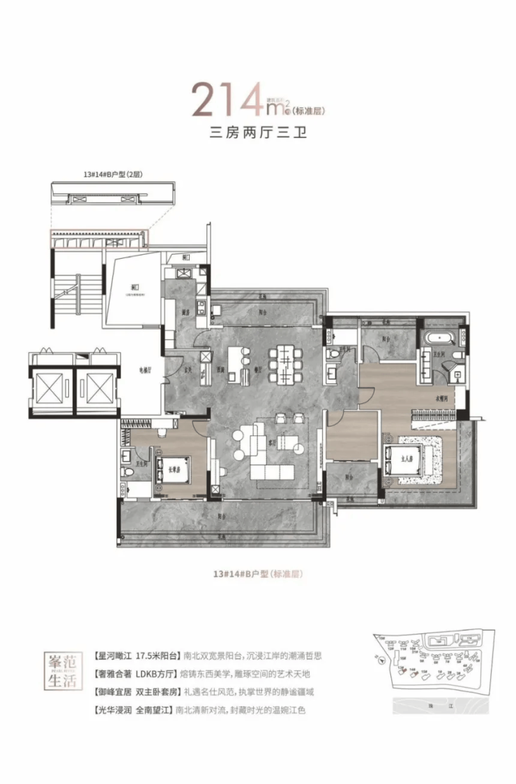 214㎡大平层:2梯2户私享电梯厅,15米南向展宽,7.8米江景阳台,次卧均带景观飘窗;