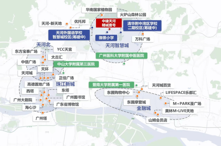 中建精诚壹号的最大生活吸引力在于“家门口的后花园+天然大氧吧”。北侧紧邻9000亩火炉山森林公园,归家即沉浸式森林氧吧,未来还将打造登山步道,实现家门口登山之旅;东侧30米即是3万㎡原生态碧湖东大湖,依湖而居,享受私家湖岸生活,南岸规划亲水公园与露营专区,湖山胜境在广州主城区极为罕见。社区内部5400㎡中央园林成为生活“心脏”,架空层泛会所、人文艺术馆、多业态商街一应俱全,下楼即可满足日常所需。2公里内直达万科广场,15分钟畅达太古汇、K11、IGC、天河城等天河核心商圈,20分钟可达多家三甲医院。自驾优势突出,毗邻科韵路、华观路,靠近华南快速与沈海高速出入口,火炉山隧道开通后,去金融城、琶洲、珠江新城仅需15-30分钟。整体生活半径兼顾自然生态与城市繁华,实现“推窗见山湖、出门享都市”的无缝切换