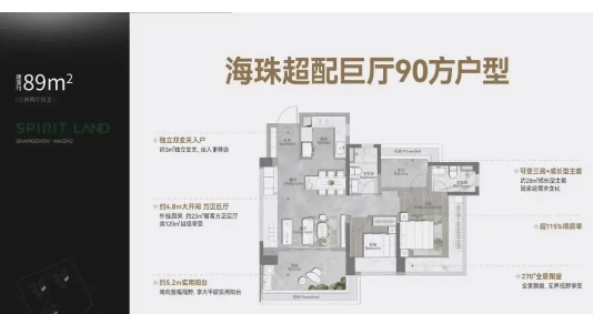 89㎡三房两厅两卫:全南向布局,4.8米阔朗客厅搭配270°飘窗,采光通风俱佳,110%超高使用率让空间紧凑而不局促。总价398万起,是扎根海珠主城的高性价比选择,适合新婚夫妻或三口之家的刚需群体。
