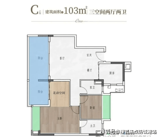 103㎡三房:改善型三房户型,空间利用率高,户型方正通透,主卧配备独立卫生间,提升居住私密性与舒适度,客厅宽敞大气,附带大阳台,视野开阔,适合对居住品质有一定要求的家庭。