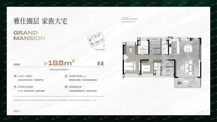 188㎡户型:楼王户型,四房三卫,双套房设计,匹配财富阶层的终极居所,拥有约18米瞰江尺度。