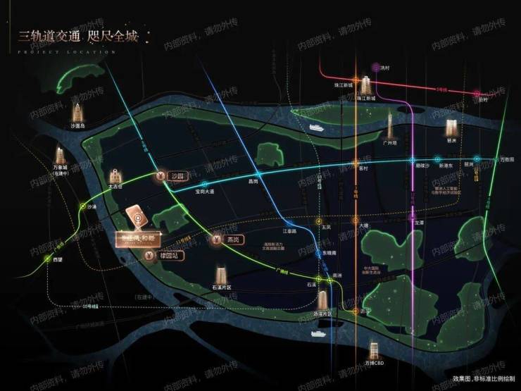 项目距离地铁8号线沙园站约820米,11号线棣园站(在建)约900米。通过换乘或直达,可快速串联珠江新城、琶洲、金融城等核心CBD,通勤效率媲美纽约曼哈顿的滨江生活。