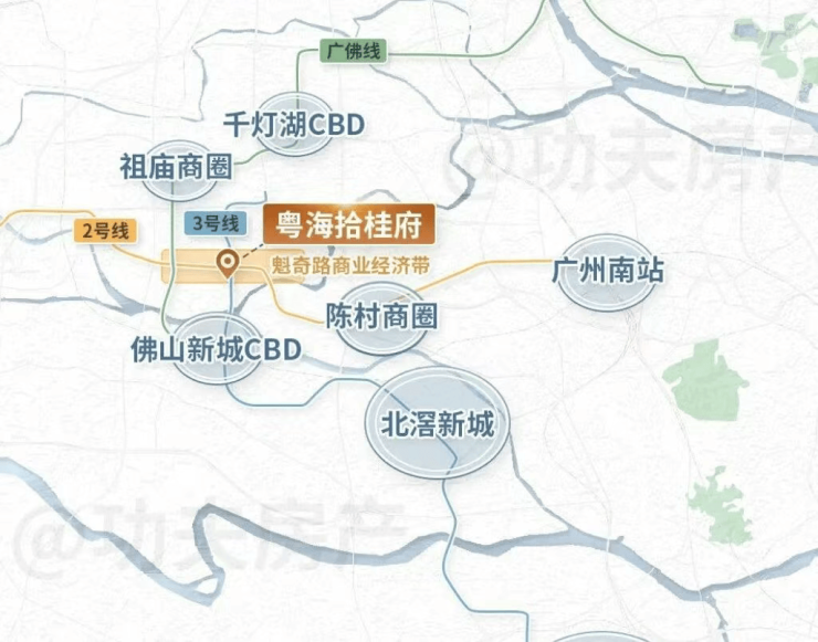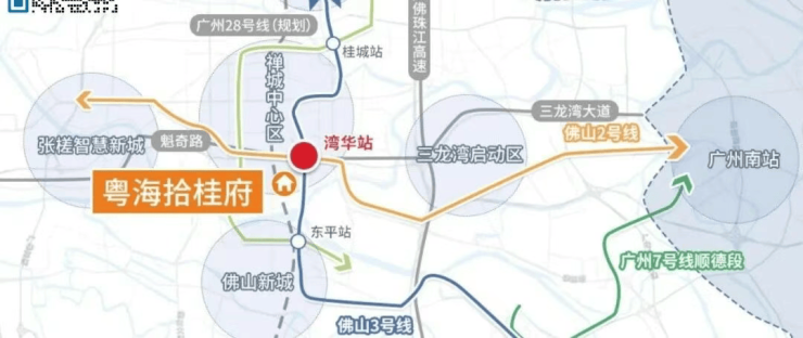 粤海拾桂府最大亮点之一是其“双地铁上盖”优势。项目距佛山地铁2号线与3号线唯一交汇站——湾华站仅约100米,步行即达。2号线已通广州南站,3号线贯通顺德、禅城、南海,未来在湾华站可1站换乘广佛线,6站直达广州南,高效融入广佛30分钟生活圈。地面交通同样优越,依托“五纵三横”路网(文华南路、佛山大道、岭南大道等纵向干道 + 季华路、魁奇路、东平路等横向动脉),驾车15分钟内可达千灯湖、祖庙、广州南站等核心枢纽。对于广佛双城通勤族而言,每日可节省大量等车与换乘时间,真正实现“多睡十分钟”的从容节奏。