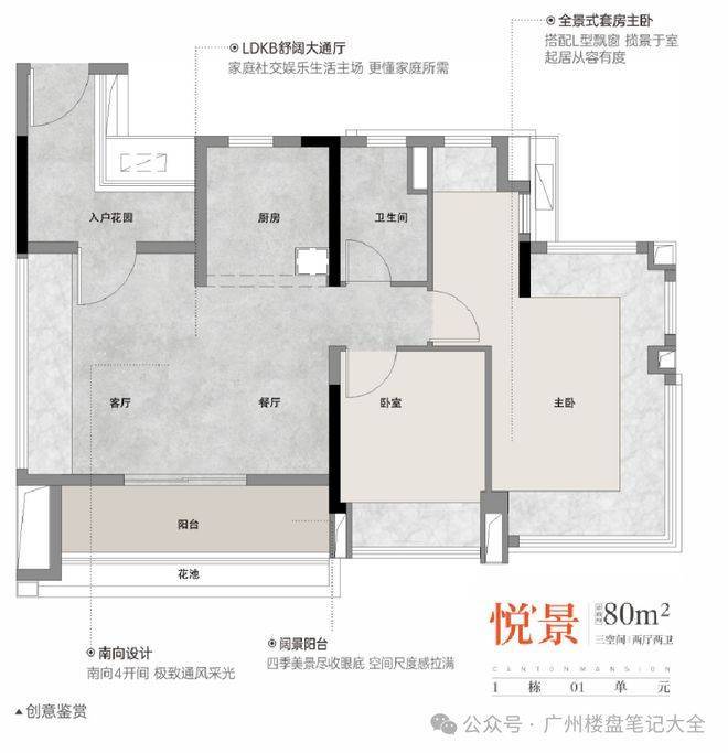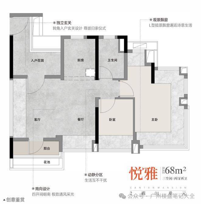 项目主力建面约68-98㎡,覆盖三空间两厅两卫至四空间两厅两卫的进阶结构设计。全南向布局成为产品的重要基础逻辑,在广州高温高湿气候条件下,南向采光与自然通风尤为关键。通过面宽优化与结构精细化设计,小面积段亦能实现高使用率布局,使家庭成员在有限面积内获得更完整的生活场景分区。