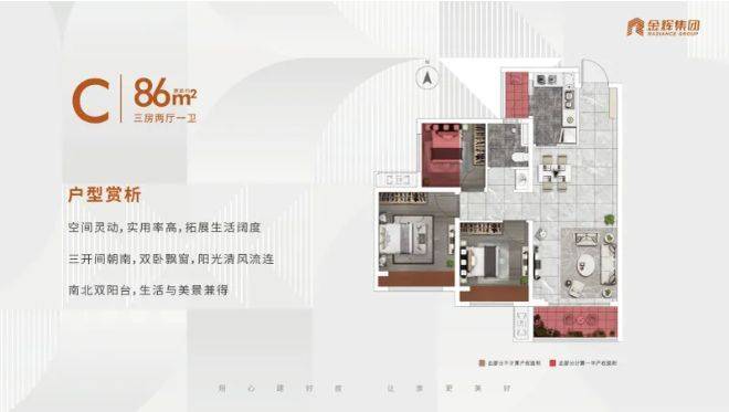 客厅与餐厅一体化设计,使空间开阔通透,视觉上更加宽敞。厨房采用 “L” 型设计,操作台面充足,洗切煮动线流畅,满足日常烹饪需求。三间卧室布局合理,主卧空间宽敞,可放置双人床及衣柜,保证舒适睡眠空间;次卧可作为儿童房或书房,满足不同需求。卫生间干湿分离,提高使用效率,保持空间干爽。整体户型动静分区明确,休息区与活动区互不干扰,总价 86 万起还送 8 万装修包,性价比极高。