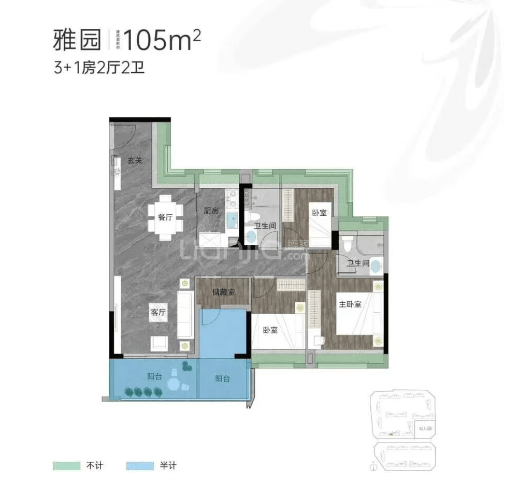 针对刚改人群,项目推出了103至105平方米的“3+1”房两厅两卫户型。这款户型实现了四开间朝南的奢侈布局,阳光洒满每一个角落。其实际使用空间可媲美旧规下的120平方米户型,足以满足三代同堂的居住需求。多出的一个“+1”房间可根据家庭需要灵活改造为书房、儿童房或储物间,极大地提升了居住的灵活性。
