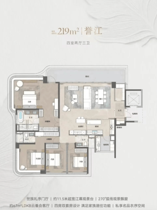 建面约228㎡四房:配置约11.5米超宽江幕观景台、约67㎡LDKB云峯会客厅,并采用双套房设计,主卧开间达6.8米,真正实现家族式尊享生活。