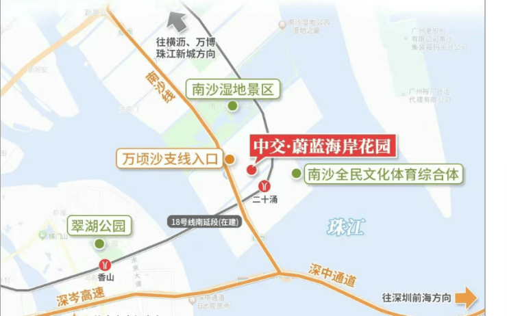项目位于南沙区万顷沙二十涌板块,紧邻深中通道南沙线收费站,距离在建 18 号线南延线二十涌站约 500 米,是广州最南端的一线海景盘。