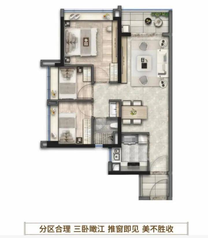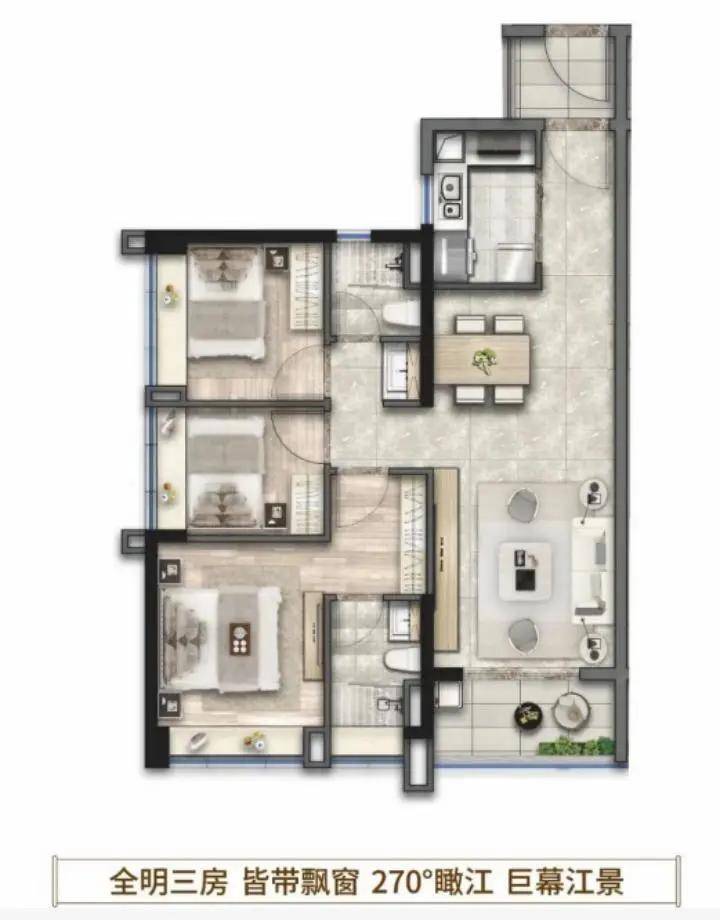 88㎡三房两卫:主卧套房配步入式衣帽间,双卫干湿分离,南向瞰江视野,总价320万元起(首付3成约96万);