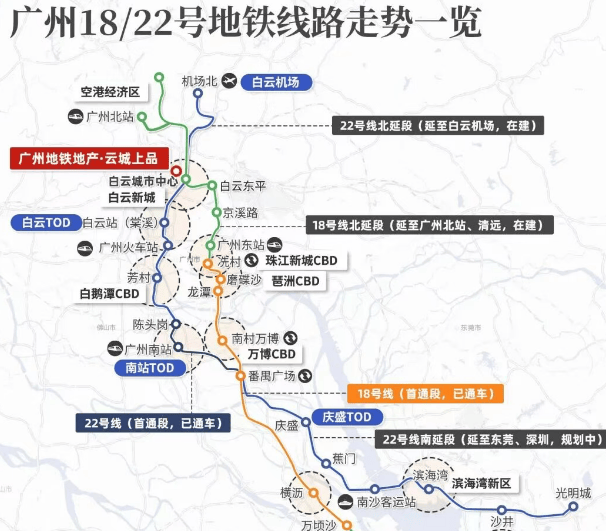 云城上品位于双高速地铁——白云城市中心站上盖,距离广州东站仅3站路程,4站可达珠江新城。通过18号线,可以直达白云机场、琶洲、珠江新城等核心区域;而22号线则串联了白云机场、广州南站以及南沙客运港等重要节点,形成了覆盖海陆空三大枢纽的城市脉络。