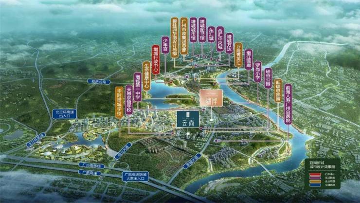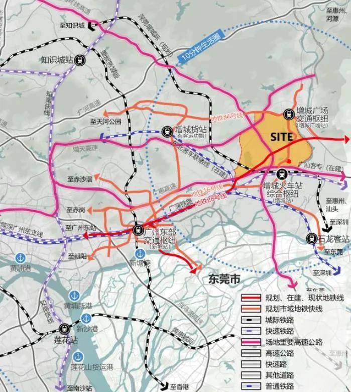 【交通路网】通过广惠高速、华南快速、增天高速(建设中)等快速通达广州市主城区,通过珠三角环线高速等高速公路快速通达深圳市区、深圳机场,实现一小时生活圈。