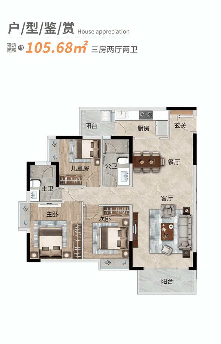 106㎡三房两厅两卫:此户型进一步优化了空间布局,双卫设计方便家庭成员使用,尤其是在早晨等高峰时段,减少等待时间。客厅宽敞明亮,搭配大尺寸窗户,采光极佳。餐厅与厨房紧密相连,操作便捷。主卧套房配备独立卫生间和衣帽间,彰显主人的尊贵身份。次卧和书房空间适中,满足居住和功能需求。整体户型方正,动静分区合理,保障居住的舒适性与私密性。