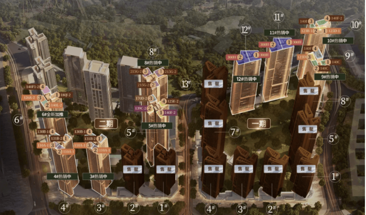 2. 在售楼栋:一期12栋、二期12栋住宅楼均已取得预售许可证,当前在售楼栋为一期1#、2#、3#、5#、6#、7#楼及二期1#、2#、4#、5#楼,均为32-47层塔楼结构,产权年限70年。