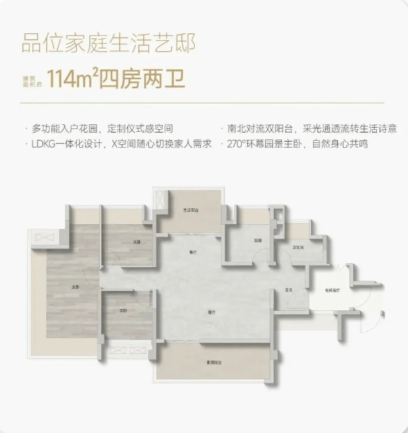 建面约 114㎡四房两卫:刚改进阶,四房设计满足二胎家庭或三代同堂的居住需求,部分户型实现独梯入户,入户花园可打造休闲空间;客厅开间宽敞,连接南向大阳台,视野开阔;主卧套房设计,带独立卫生间与飘窗,提升居住舒适度;其余三个卧室空间方正,实用性强,是改善型家庭的理想之选。