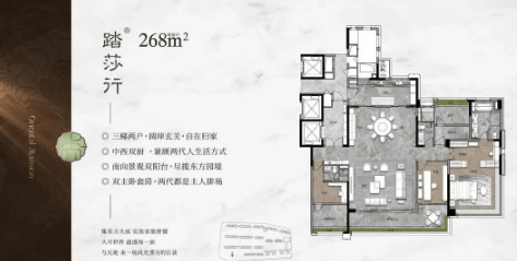 保利天瑞提供了多种户型选择,面积从约107平方米到约268平方米不等,每户均朝南,确保最佳采光和视野。特别是268平方米的大户型,采用了3梯2户的设计,并配有保姆专用电梯,保证了业主生活的私密性和便捷性。