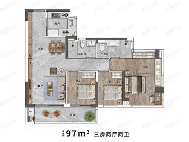 97㎡户型设计精巧,空间利用高效。四开间朝南的布局,使得阳光能够充分洒入室内,三个南向卧室保证了居住的舒适性和温暖感。长达约 6.3 米的阳台连通次卧,不仅增加了室内采光面,还拓展了生活空间,可作为休闲区,摆放桌椅,享受阳光与江景。主卧南北双面采光的设计独具匠心,进一步提升了居住的舒适度,让居住者无论白天黑夜都能感受到自然光线的魅力。整体户型动静分区合理,活动区与休息区互不干扰,为家庭生活营造出温馨舒适的氛围。
