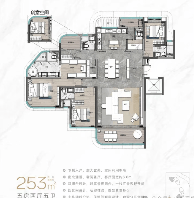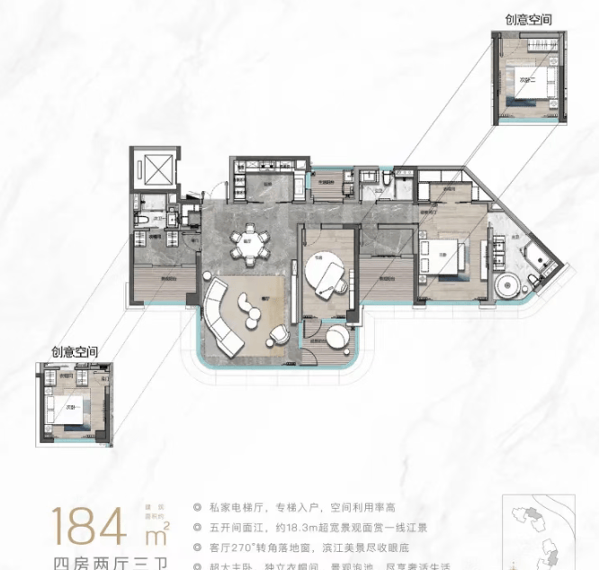 广州滨江上都一期璇湾主推建面约109-253㎡的一线瞰江华宅以及建面约350㎡的临江大平层公馆。楼王产品璇湾壹号面积段为184-255㎡的4至5房,拥有高达18.3米的瞰江面和最高270°观景面,距离江边仅约100米。