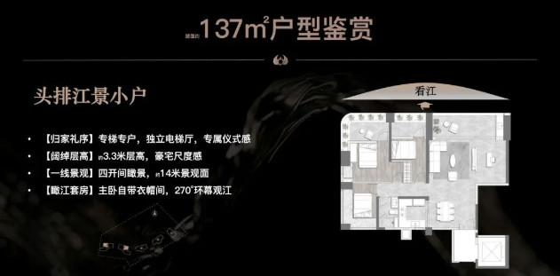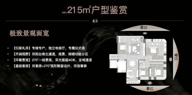 特别值得一提的是东区的高端产品定位,包括A1-A6#(无A4)五栋住宅,提供260㎡和290㎡的大平层户型,保证每户都能享有最佳观江视野。