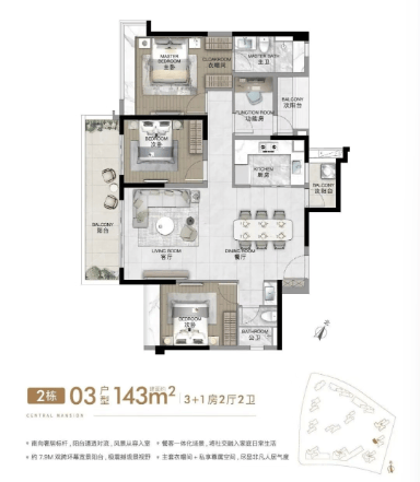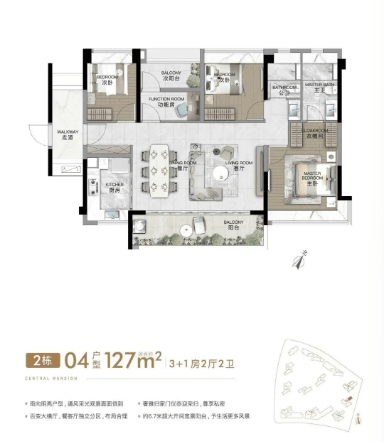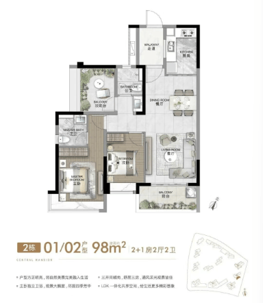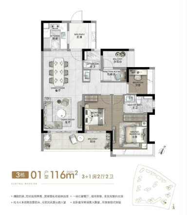 项目规划了12栋24-30层高的住宅,分为两期开发。目前在售的一期包括1-4号楼,均为现楼精装交付。户型涵盖约98㎡的2+1房、116㎡的3+1房、127㎡和128㎡的3+1房等多种类型,满足不同家庭的需求。其中,98㎡户型三开间南向采光,配备超大景观阳台和270°转角飘窗;116㎡户型采用U型厨房布局,南北通透;127㎡和128㎡户型则以大面宽横厅设计,最大化利用景观资源。所有户型均采用高标装修交付,配备VRV中央空调、全屋智能系统、全屋紧扣厨卫等高端设备,外立面采用双层中空low-e玻璃和中置百叶材质,有效隔热降噪。