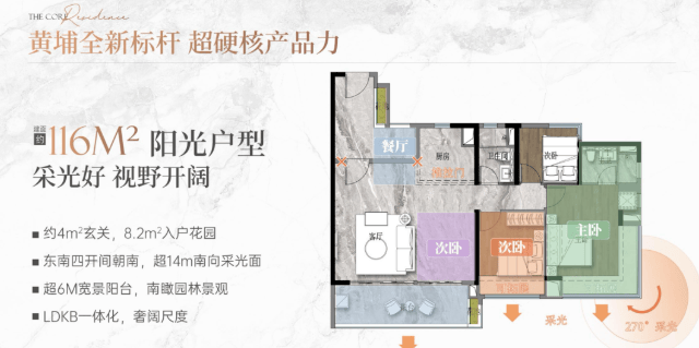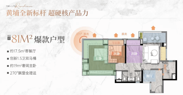 项目采用围合式布局,由6栋47层高层住宅组成,其中2#楼为“楼王”产品,两梯四户;其余楼栋为三梯六户。所有户型均以超100%使用率打造,这一指标在黄埔乃至整个广州都极为罕见,极大提升空间实用性与性价比。
