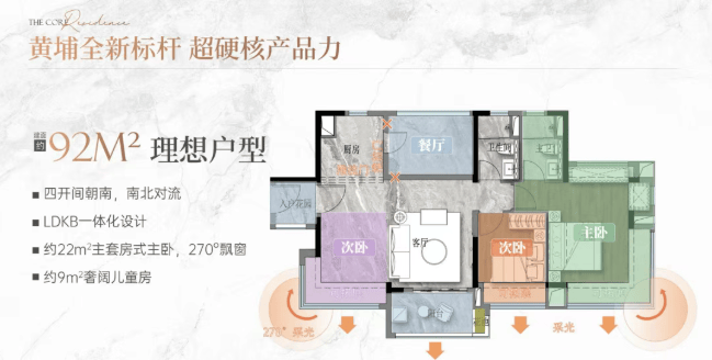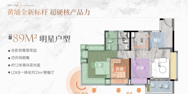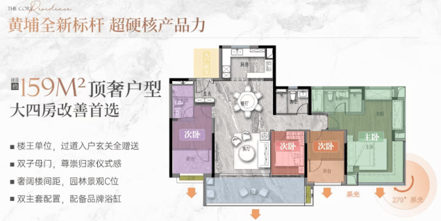 2#楼王:两梯四户,面积段为92㎡与159㎡,东南向无遮挡,可瞰中心园林及远处公园,高区视野甚至可远眺珠江新城乃至广州塔;