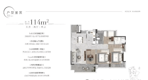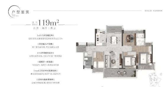118㎡四房两厅两卫户型在空间设计上更加注重居住的品质感。约 3.15 米层高,四开间朝南,主卧采用 270° 超广角观景舱设计,视野无遮挡,能够最大限度地欣赏社区园林景观。