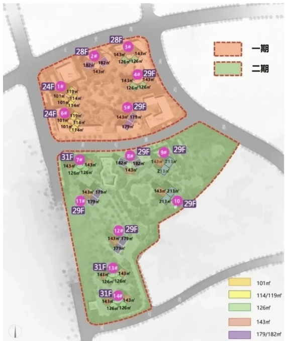 项目一共规划了 14 栋住宅,分南北地块开发,目前主推 1 栋、2 栋、7 栋,待售 8 栋,具体在售楼栋信息如下: