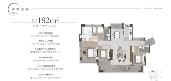 182㎡四房两厅三卫户型,是项目的顶级产品,专为终极改善客户打造。约 3.3 米墅级层高,搭配约 5.1 米净开间的阔绰宽厅,彰显了豪宅的气场与格调;四开间朝南设计,确保了全屋的采光与通风。