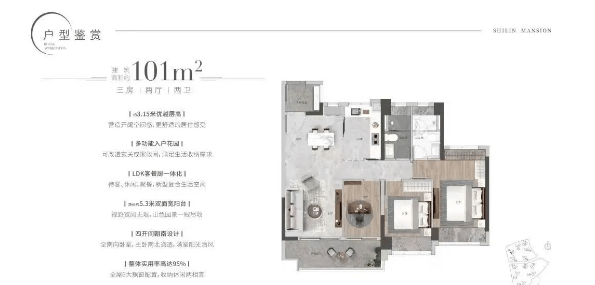 该户型是项目的入门级改善产品,设计紧凑实用,却不失舒适度。约 3.15 米的优越层高,让空间显得更加通透开阔;净长约 5.3 米的双面宽阳台,既保证了充足的采光,又为业主提供了观景、晾晒的多功能空间。