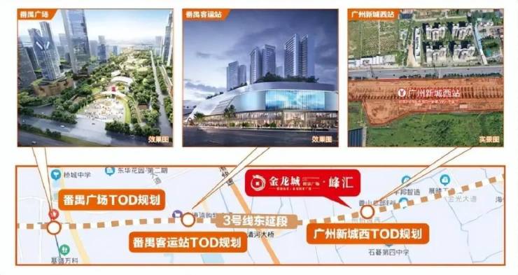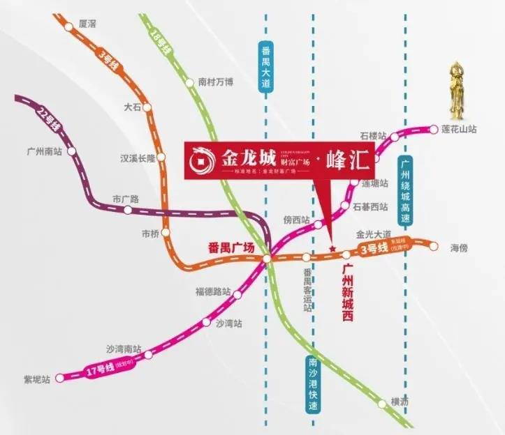 金龙城·峰汇地处广州市番禺区,位于广州新城城市新轴心位置,战略地位显著。周边亚运大道、市莲路两条城市主干道贯穿,南沙港快速、广澳高速双高速出口环绕,构建起高效的陆路交通网络,使项目与城市各核心区域紧密相连。同时,坐享广州新城西TOD、番禺客运站TOD、番禺广场TOD三大TOD发展红利,TOD模式将交通、商业、居住等功能有机融合,为区域带来强大的发展动力与无限潜力。随着区域的不断发展,金龙城·峰汇的价值也将不断提升。