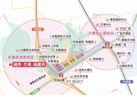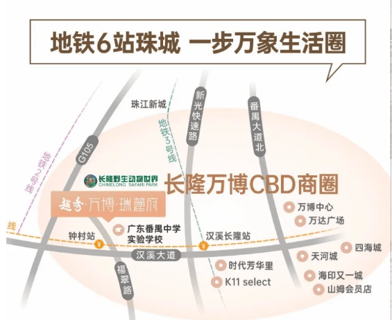 地处长隆动物世界西南侧,紧邻钟顺路,属长隆万博 CBD 扩容核心区(规模达 7.2 平方公里,超珠江新城)。自驾经钟顺路衔接汉溪大道、南大干线(已开通),10 分钟直达万博 CBD,30 分钟抵达珠江新城,40 分钟内可至琶洲、大学城。公共交通方面,距 7 号线钟村站约 1.2 公里,2 站到万博,3 站至广州南站,6 站可达珠江新城,轻松融入广州核心交通网。