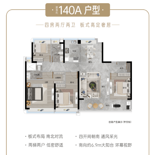 在售 140-253㎡南向板式住宅,涵盖四至五房,部分户型可北望长隆野生动物世界。主力户型包括 140㎡高定四房(南北对流、全屋精装)、171㎡奢适五房(8F 小高层、专梯入户)、205-253㎡环幕景观楼王(双阳台、双主卧套房,阳台宽达 9-10.3 米),均采用宝格丽酒店级精工,搭配杜拉维特等国际品牌。总价近 700 万起,首套房或二套房无贷款结清客户可享三成首付,200 万即可入手。