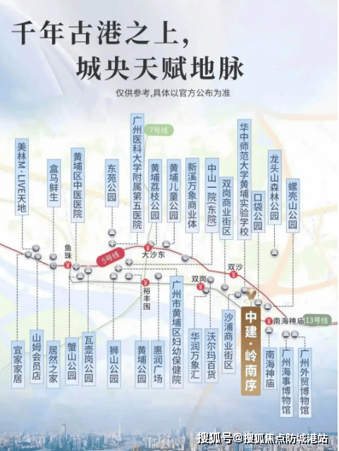 中建岭南序横跨 5 号线以及 13 号线,项目部分组团靠近 5 号线,部分组团靠近 13 号线。目前首开组团中建海丝城一期靠近 5 号线双沙 B 出口 50 米,乘坐 5 号线无需换乘直达金融城、珠江新城。中建岭南序步行距离约 800 米可达 13 号线南海神庙站(一期已通车,二期即将通车),30 分钟即可直达珠金琶 CBD。
