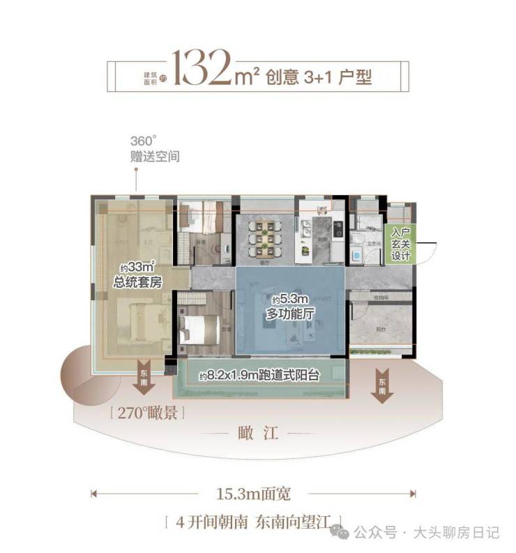 建面约112㎡、132㎡3+1户型,定位改善型产品,全南向布局,户型方正通透,动静分区清晰,3+1灵活空间设计,可根据家庭需求灵活改造为书房、儿童房、康养房等,适配二孩家庭、多代同堂等多元改善需求。其中,132㎡户型采用阔绰四房设计,客厅开间达4.2米,连接超大南向阳台,视野开阔,可览江看园,兼顾景观体验与日常休闲需求;主卧套房设计,配备独立卫浴与衣帽间,保障主人居住的私密性与舒适度;其余卧室采光通风俱佳,空间尺度宽裕,可满足家庭不同成员的居住需求。所有改善户型均延续高使用率优势,实际使用空间充足,吊打周边同类产品,凸显项目产品硬实力。