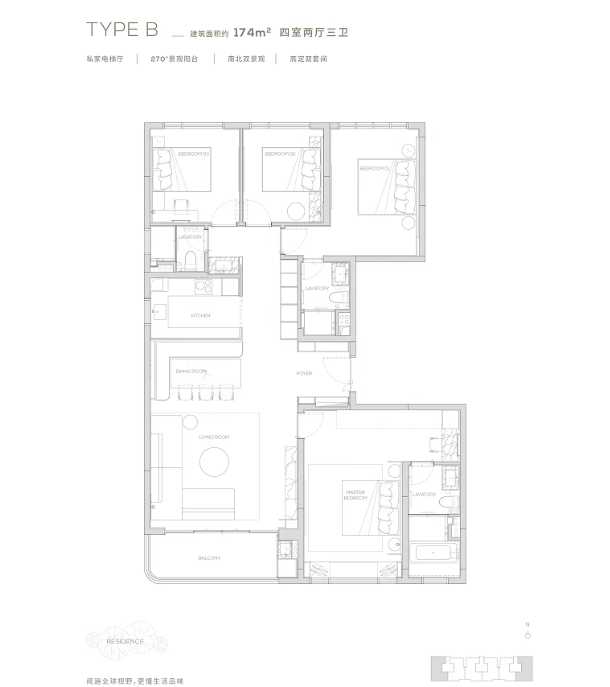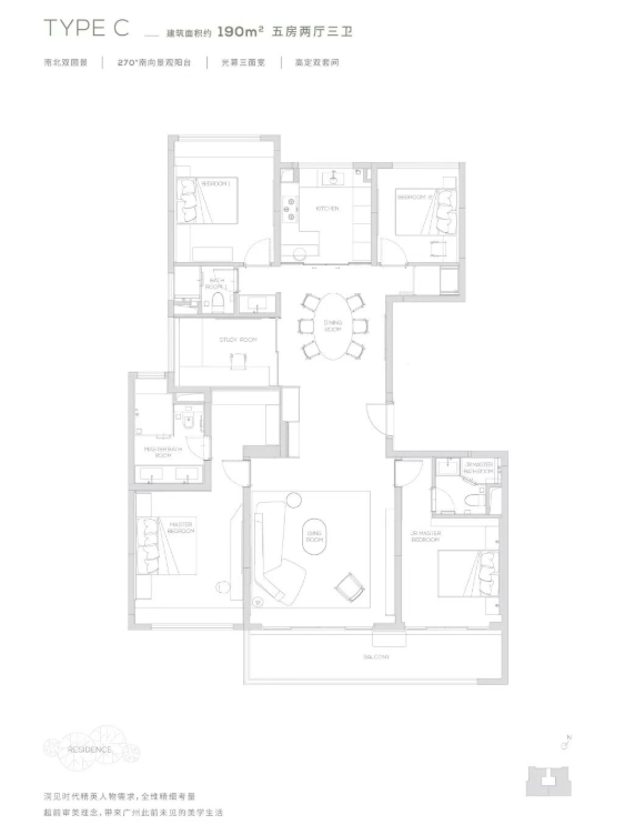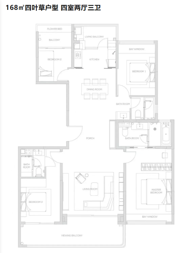 在产品打造上,合生·缦云延续了缦系豪宅一贯的极致标准。整个社区规划42栋16-17层纯板式小高层,总户数仅1270席,容积率极低,确保每一户都能享有优越的采光、通风与景观视野。所有楼栋均采用南北通透布局,户型设计以“四叶草”格局为主,如建面约168㎡四房两厅三卫,功能分区清晰,动线流畅,兼顾家庭成员的独立性与互动性。