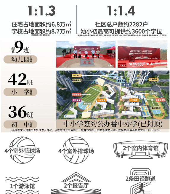 教育上,配备 9 班幼儿园、42 班小学和 36 班初中,共 3600 个学位,引进公办名校番禺中学办学,师资有保障,主要面向小区业主子女招生。生活方面,自带 6000 平底商,周边虽缺乏大型商业,但万博商圈的万达广场、天河城等可满足购物需求。项目自带约 2.5 万㎡双公园,配建约 8500㎡中央公园已开放,二期延续 POD 园林理念打造艺术美学社区及四大主题泛会所,临近七星岗森林公园。同时,还有 YUE 系会所空间,还原千万级豪宅归家体验。