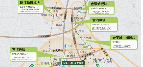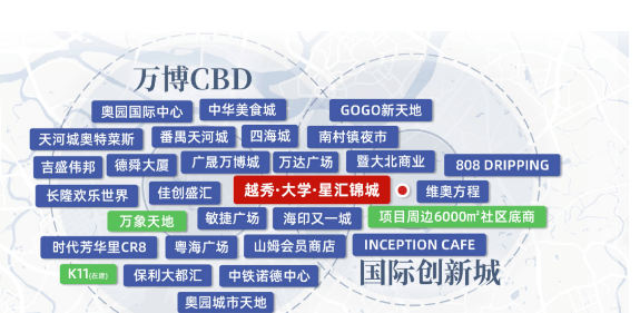 越秀大学・星汇锦城位于番禺南村板块,临近国际创新城,距离万博 8 公里,大学城 10 公里。虽然距离地铁 7 号线板桥站约 3 公里,步行或公交接驳耗时较长,但骑行电动车 10 多分钟可达。同时,小区业主楼巴、公交首末站及地铁接驳巴士已开通,高峰 15 分钟一班。自驾出行更是便利,兴业大道、南大干线等番禺东西向发展大动脉,串联万博 CBD、广州南站等板块;南沙港快速、新化快速、番禺大道无缝衔接 “金珠琶”,经金光东隧道可速达大学城一期。