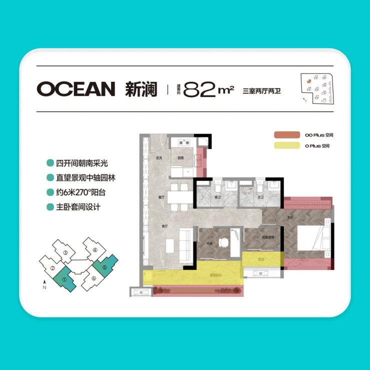 约82㎡3房2厅2卫:南向看山,景观与采光双优。该户型主打南向景观优势,配备6米大阳台,270°南望社区中轴园林,高层户型更可远眺帽峰山,景观绝美。四开间朝南设计,确保室内全天采光充足,同时实现南北通透,空气流通性好,营造清爽舒适的居住环境。