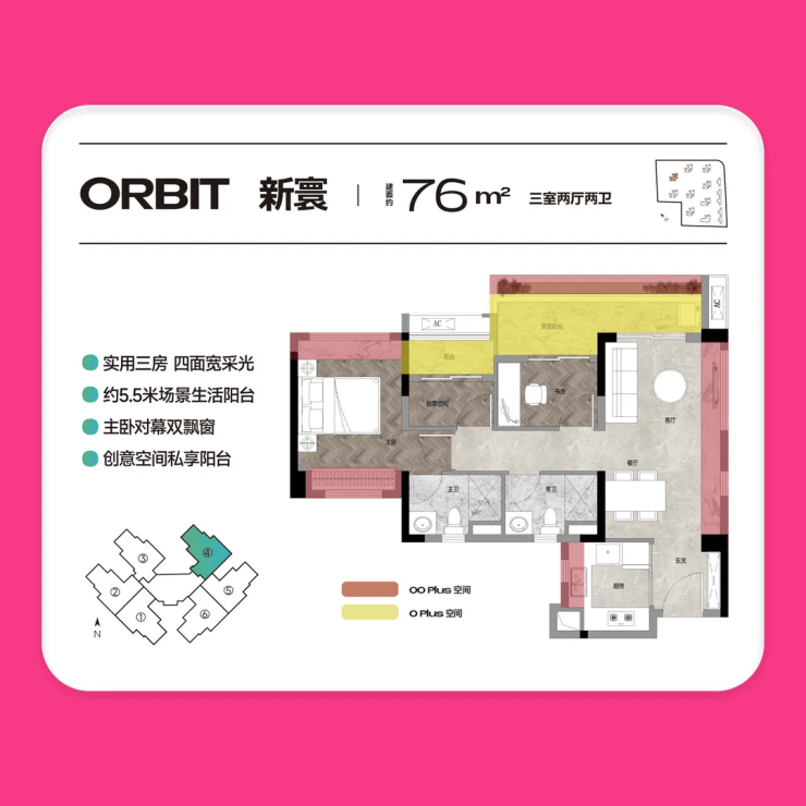 约76㎡3房2厅真2卫:细节升级,舒适度拉满。该户型在74㎡户型的基础上进行细节优化,整体布局与核心优势保持一致,同样配备5.5米大阳台、270°视野与四开间采光设计,实用率高达95%。户型在空间尺度上略有提升,客厅与卧室的活动空间更宽敞,居住舒适度进一步升级。