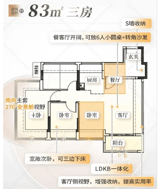 建面约 83㎡南向三房两卫,为单边位设计,套内空间开阔。对比之前的新规户型,该户型在实际居住体感上更为出色,次卧尺度充足,能做到三边下床,满足日常居住的实用性需求。